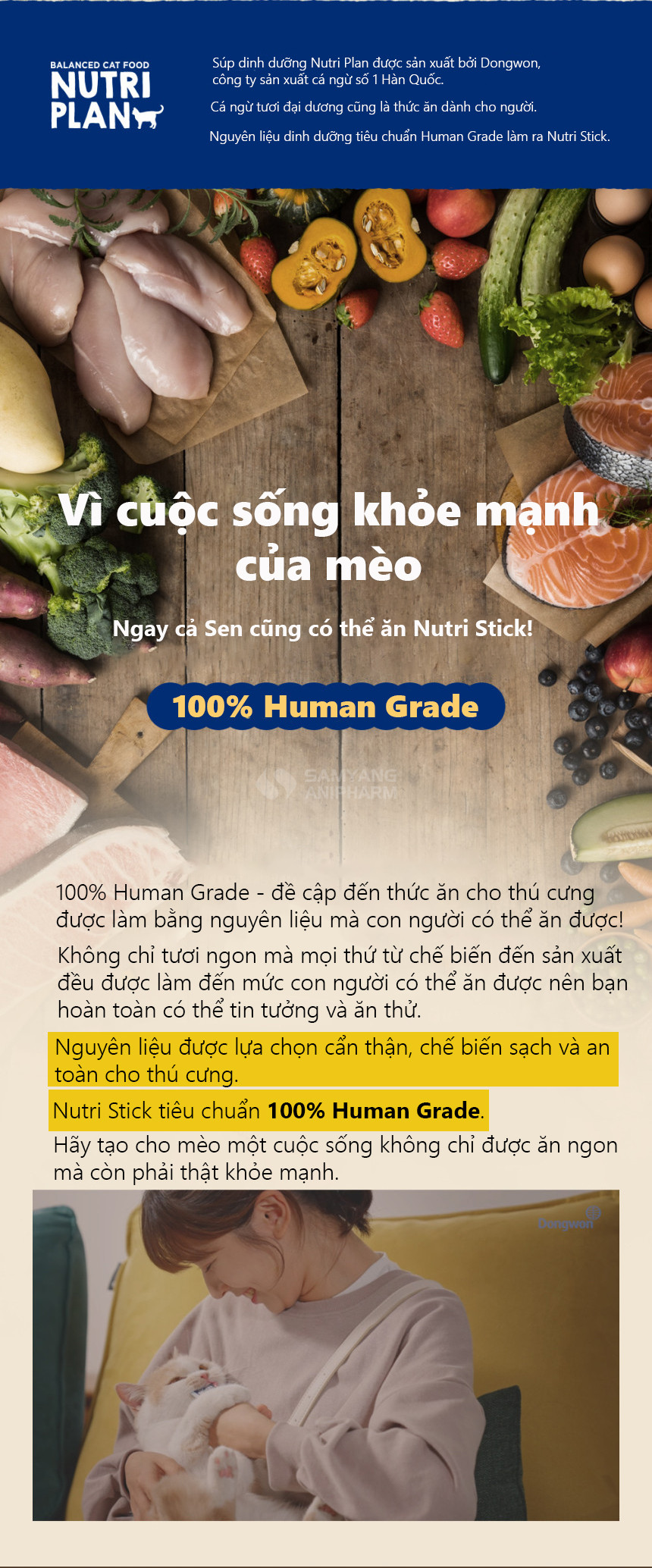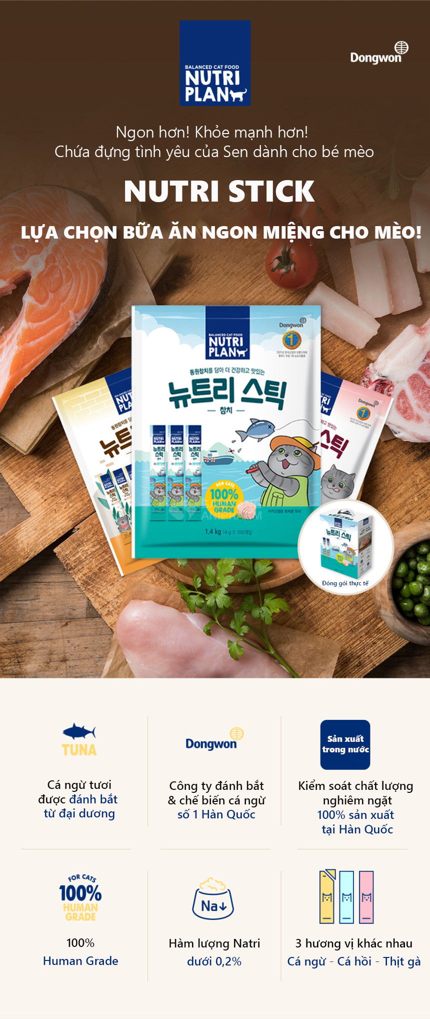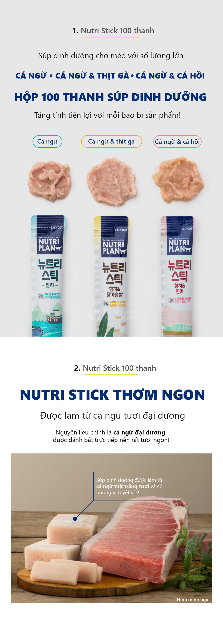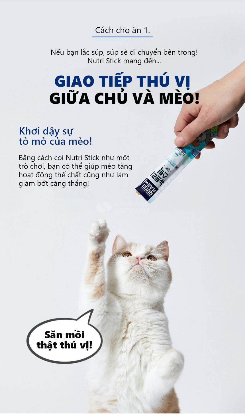 Súp dinh dưỡng Nutri Plan – Nutri Stick là món ăn nhẹ dành cho mèo đứng top 1 thị trường Hàn Quốc. Sản phẩm đã được xuất khẩu sang những thị trường lớn và “khó tính” như Nhật, Trung, Bangladesh. Tại thị trường Việt Nam, Nutri Stick được Samyang Anipharm Việt Nam độc quyền phân phối với hàng triệu sản phẩm đã được bán ra, đặc biệt là được những chú mèo kén ăn cũng vô cùng yêu thích.