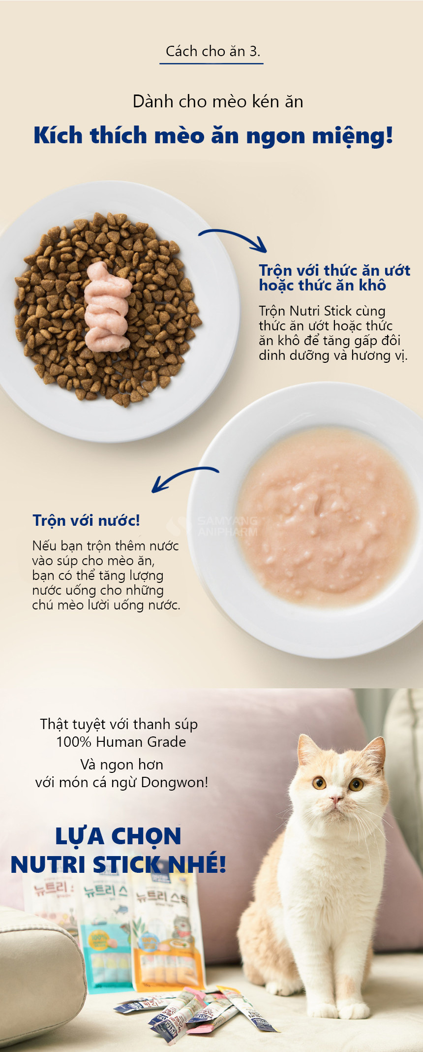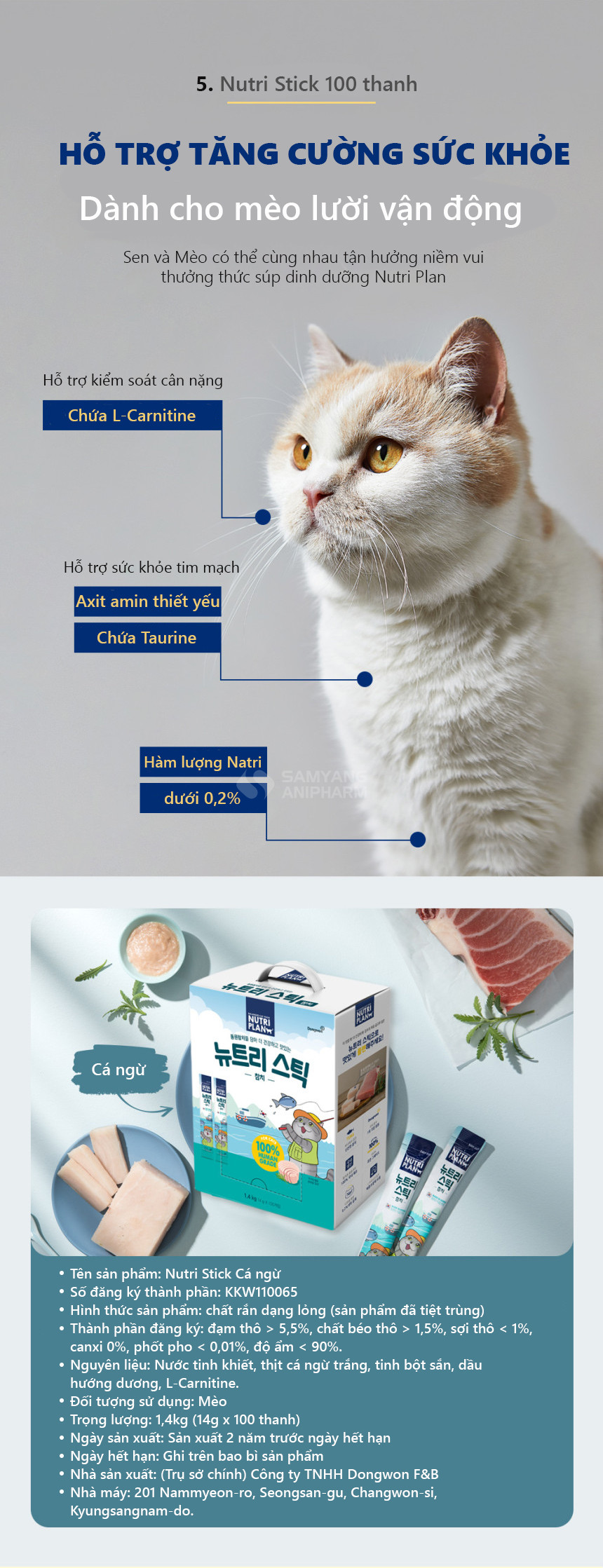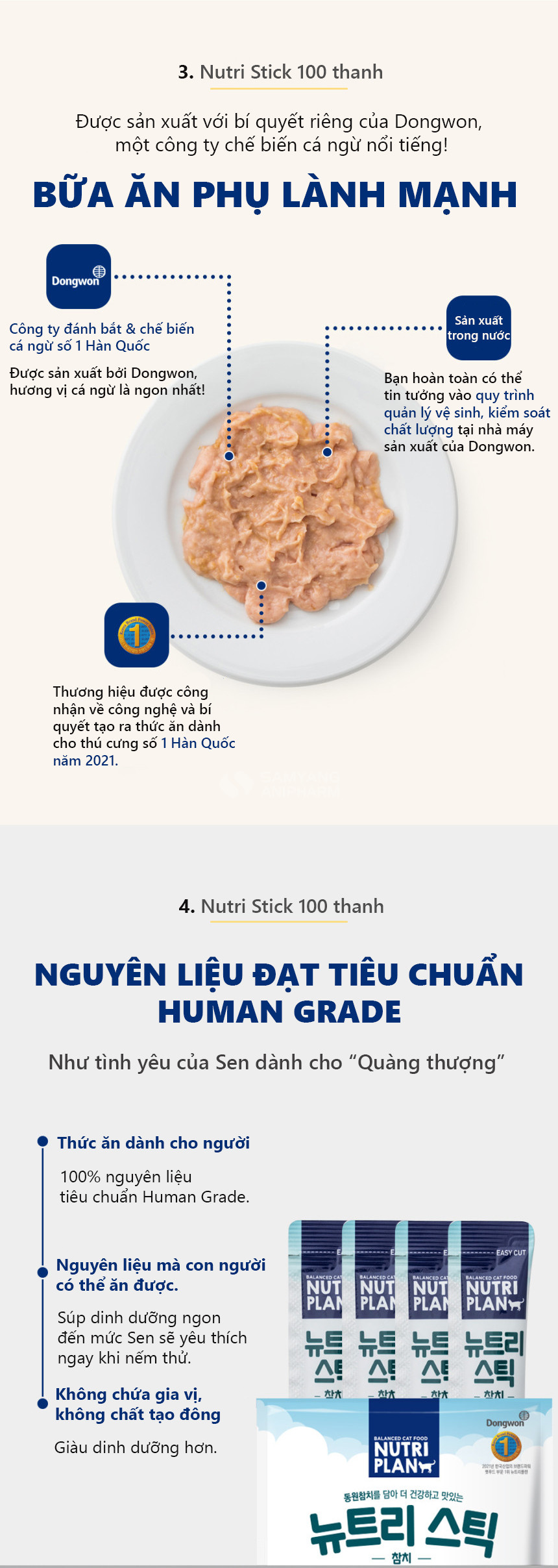 Súp dinh dưỡng Nutri Plan – Nutri Stick là món ăn nhẹ dành cho mèo đứng top 1 thị trường Hàn Quốc. Sản phẩm đã được xuất khẩu sang những thị trường lớn và “khó tính” như Nhật, Trung, Bangladesh. Tại thị trường Việt Nam, Nutri Stick được Samyang Anipharm Việt Nam độc quyền phân phối với hàng triệu sản phẩm đã được bán ra, đặc biệt là được những chú mèo kén ăn cũng vô cùng yêu thích.